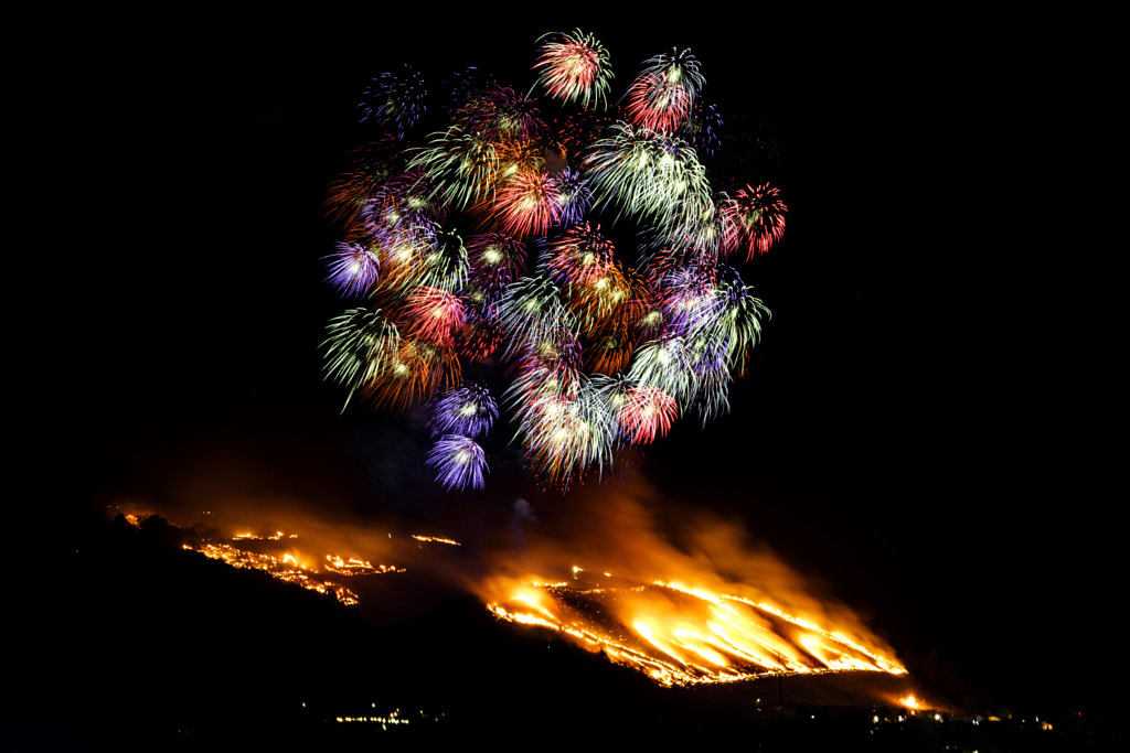 というものである。鎮魂のための行事というのが定説のようであるが、山焼きの歴史自体はまだ浅めである。平成21年(2009年)には、山焼きは1月第4土曜日に開催されるようになった。また、平成22年(2010年)には、平城遷都1300年を契機に花火が約600発打ち上げられた。写真の2015年の山焼きでも多くの花火が打ち上げられていた。この年の火のまわりはあまりよくなかった。露出はずっとシャッターを押しっ放しの状態で、カメラに布を時々被せながら撮影した。したがって露出時間が819秒となっている。絞り値はF11としていた。